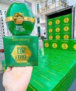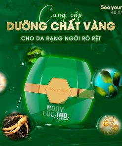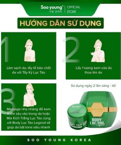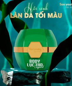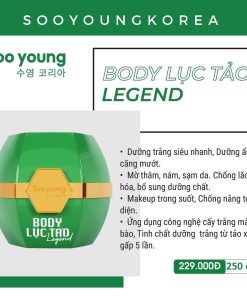 Kem body lục tảo Legend-Soo young thành phần chứ: water, glycerin, glutathione, ascorbic acid, niacinamide, kojic, acid. titanium dioxide, carbomer, hyaluronic acid, alpha-arbutin, tocopheryl, collagen………