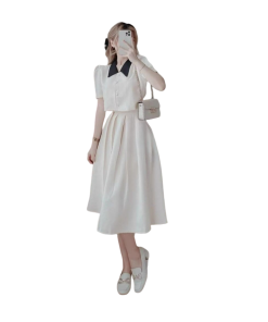 - Kiểu dáng áo cài nút, váy xòe dài.