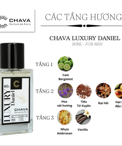 - Chava Daniel là sự khéo léo pha trộn giữa Cam Bergamot và hương Ambroxan, tạo nên một khoảng màu xanh tươi mát của bầu trời. Cùng sự mạnh mẽ và ấm nồng của tiêu đen và gỗ tuyết tùng khiến mùi hương trở nên lôi cuốn không điểm dừng. Tổng thể mùi hương hòa quyện lại với nhau tạo nên một hương thơm khó có thể cưỡng lại được.