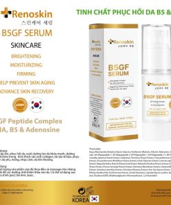 Renoskin B5GF chứa các yếu tố tăng trưởng, tế bào gốc Stemcell: EGF, FGF, IGF, VEGF Peptide các vitamin và dưỡng chất nuôi dưỡng và ức chế thâm và sạm da như Vitamin B5, Niacinamide, Arbutin, Allantoin, Adenosine, HA…
