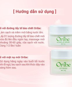 - Mặt nạ dưỡng môi Lip Mask: Sau khi tẩy tế bào chế bằng Oribe Sugar Lip Srub: Bôi một lớp mỏng lên môi, giúp làm dịu, dưỡng ẩm và tái tạo tế bào môi. Sử dụng hàng ngày vào buổi tối trước khi đi ngủ, lau sạch sau khi thức dậy vào sáng hôm sau.