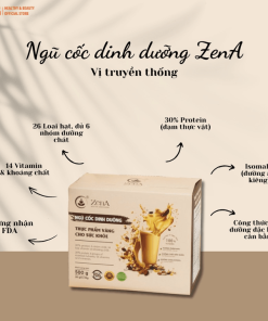 - Ngũ cốc ZenA là sự kết hợp của hơn 20 loại hạt khác nhau, bao gồm đậu nành, đậu đỏ, óc chó, hạnh nhân, hạt điều, hạt bí, hướng dương, hạt sen, đậu gà, đậu Hà lan… Sản phẩm với 6 nhóm dưỡng chất (bột đường, chất béo tốt, đạm thực vật, chất xơ, vitamin, khoáng chất), đặc biệt hàm lượng đạm thực vật (protein) tới 30% giúp cung cấp lượng đạm sạch cho cơ thể chữa lành và sản sinh thế hệ tế bào mới khoẻ mạnh góp phần phòng ngừa các bệnh chuyển hoá như mỡ máu, cao huyết áp, tim mạch, tiểu đường, gout, thừa cân, béo phì, ung thư…