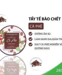 Scrub tẩy tế bào chết cà phê Milaganics loại bỏ nhẹ nhàng lớp tế bào chết trên da, đồng thời kích thích sản sinh các tế bào mới nhờ bột cà phê hạt mịn Robusta và đường nâu. Sự kết hợp với các thành phần an toàn, có nguồn gốc 100% từ thiên nhiên như dầu Olive, dầu cám gạo, mật ong, nước nha đam cùng Vitamin E, Glycerin giúp dưỡng ẩm và làm da trở nên sáng màu, giảm thâm sạm.