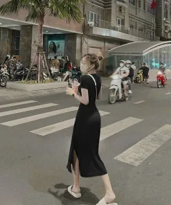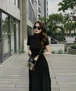 - Thiết kế cổ tròn, đầm body xẻ tà dễ mặc.