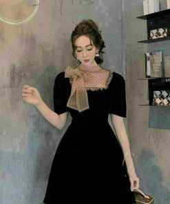 Tên sản phẩm: Đầm đen phối voan lưới cổ buột nơ V106 – CLOUDY DRESS
