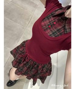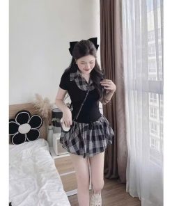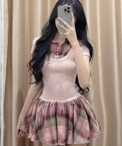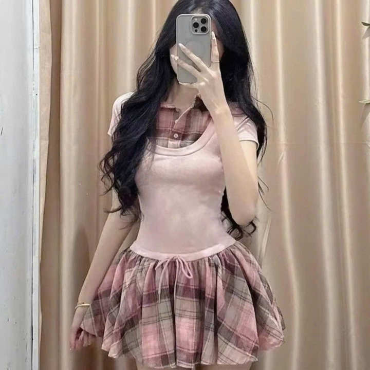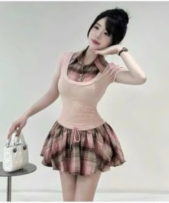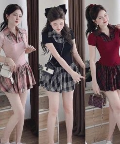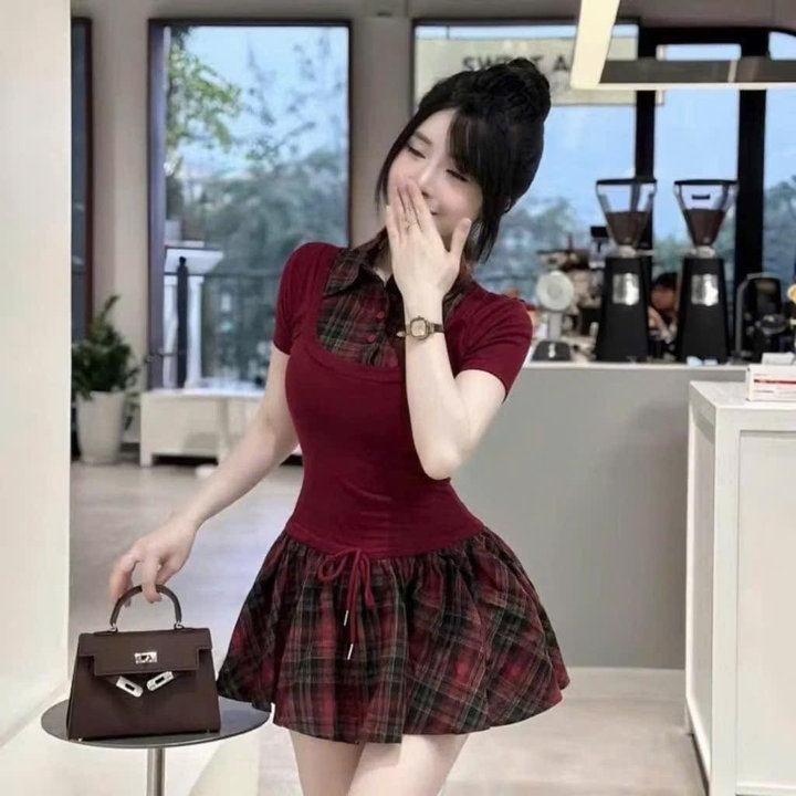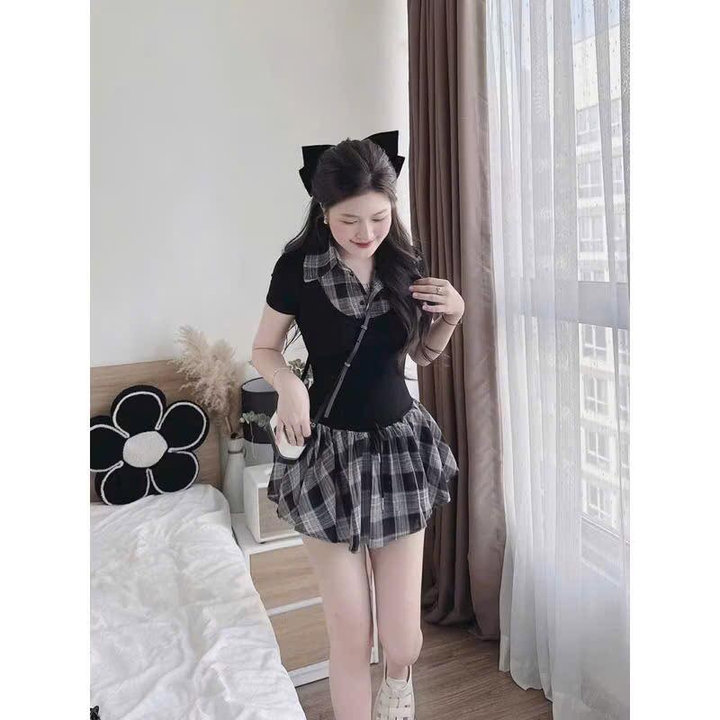 ĐẦM ĐŨI CARO CỔ BẺ PHỐI TĂM LẠNH KHÓA KÉO KÈM QUẦN RỜI TB86DR-NANA FREESIZE < 52KG
