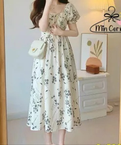 Tên sản phẩm: ĐẦM MIDI LỤA HOA TAY BỒNG NHÚN NGỰC MD122 – MIN CORNER