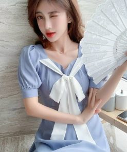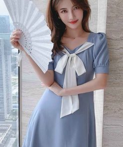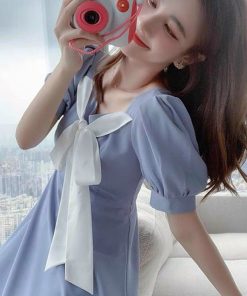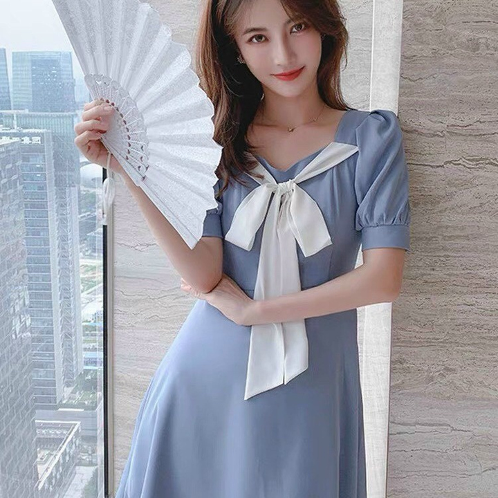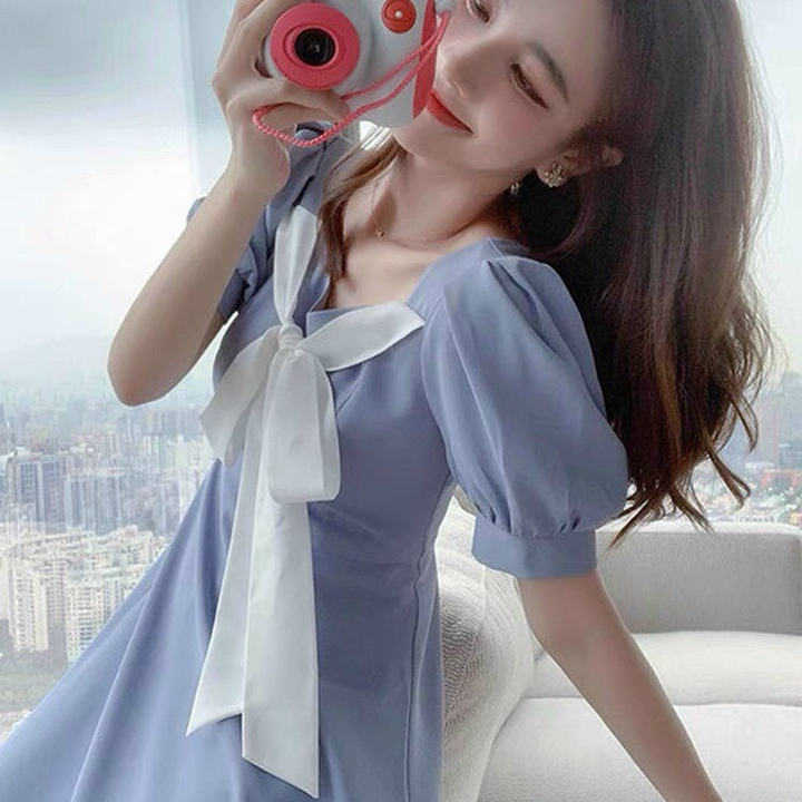 Tên sản phẩm: Đầm ngắn màu xanh caro chất kate đính kèm nơ viền bèo chân váy V108 – CLOUDY DRESS