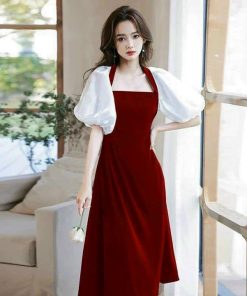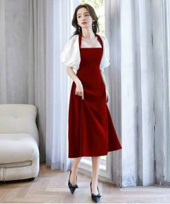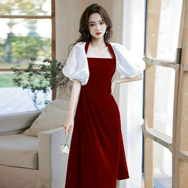 Đầm nhung xòe dài phối tay voan, đầm dự tiệc cúp ngực có mút ôm eo quyến rũ sang trọng.