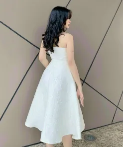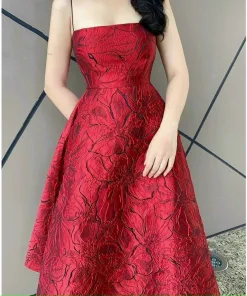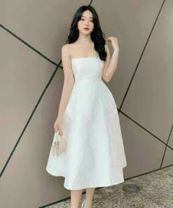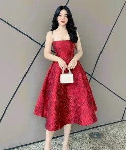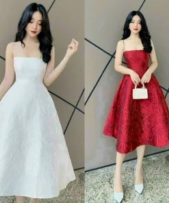 Tên sản phẩm: ĐẦM NỮ 2 DÂY CÚP NGỰC CÓ MÚT ÔM EO DÁNG XÒE DÀI CHẤT GẤM HOA T943