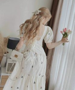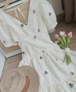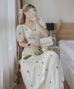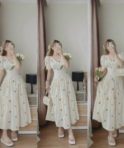 Tên sản phẩm: ĐẦM NỮ CỔ TIM TAY NGẮN DÁNG XÒE CHẤT LỤA HOA M543