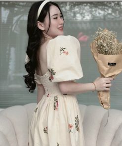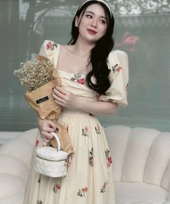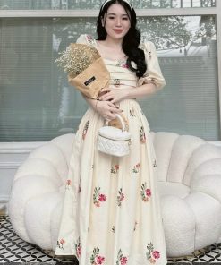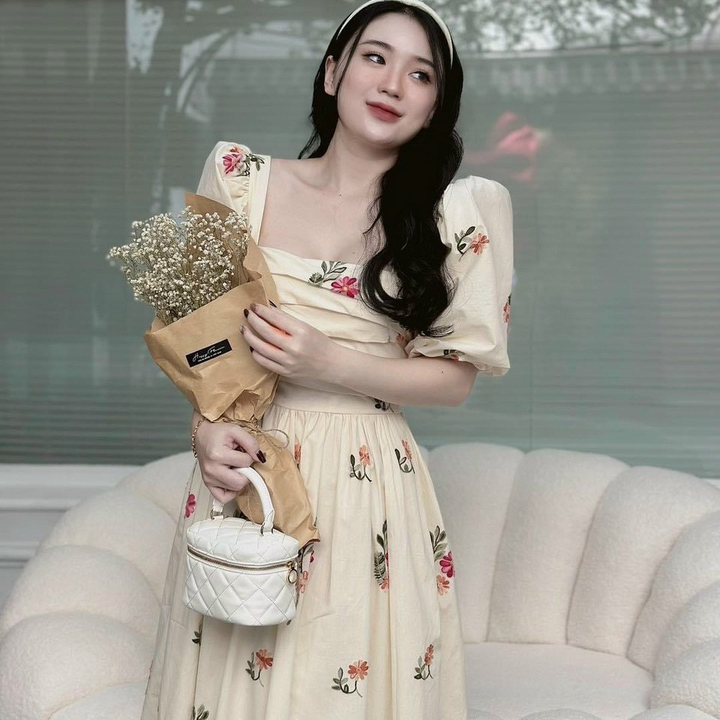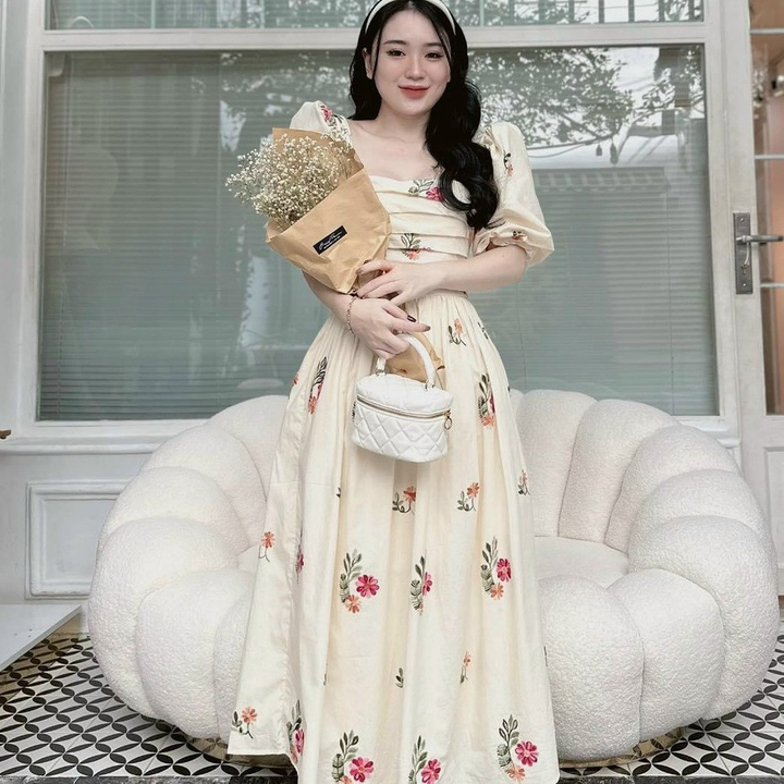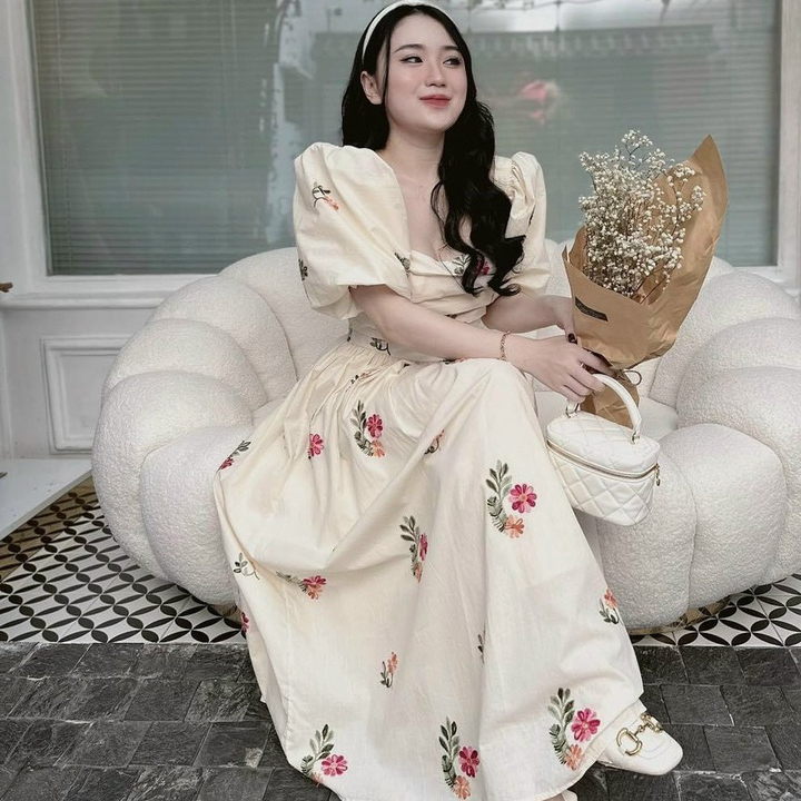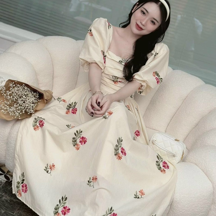 Tên sản phẩm: ĐẦM NỮ CỔ VUÔNG TAY PHỒNG DÁNG XÒE CHẤT VOAN HOA CHINFON 2 LỚP CAO CẤP T869