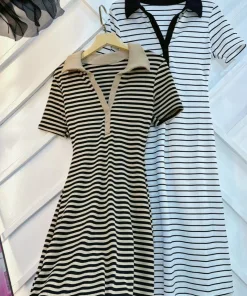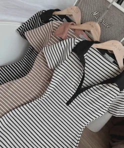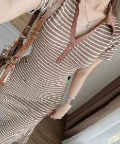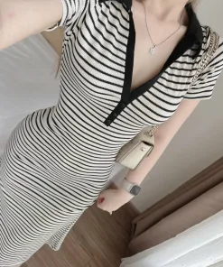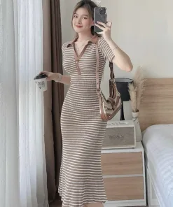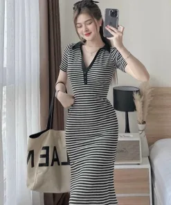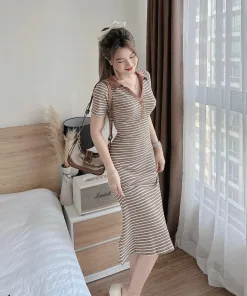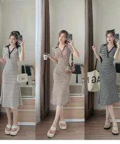 Tên sản phẩm: ĐẦM NỮ ÔM BODY CỔ PHOLO TAY NGẮN DÁNG DÀI CHẤT THUN GÂN SỌC M785