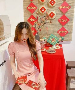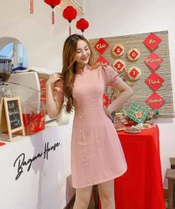 Tên sản phẩm: ĐẦM NỮ THIẾT KẾ CỔ TÀU TAY BỒNG ĐÍNH CƯỜM DÁNG CHỮ A ÔM EO TÔN DÁNG V111