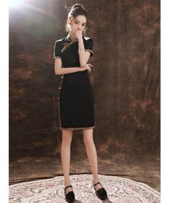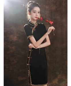 Đầm sườn xám đen cổ điển siêu đẹp viền cổ tay V143