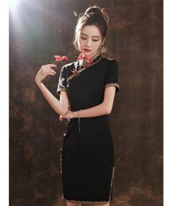 Đầm sườn xám đen cổ điển siêu đẹp viền cổ tay V143