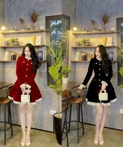 Đầm tay dài xòe tầng xếp ly túi giả cài nút thật cổ và tay phối bèo, đầm dự tiệc cúp ngực có mút ôm eo quyến rũ sang trọng.