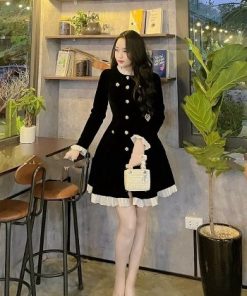 Tên sản phẩm: Đầm Tay Dài Xòe Tầng Xếp Ly Túi Giả Cài Nút Thật Cổ Và Tay Phối Bèo – Haka Mây