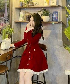 Đầm tay dài xòe tầng xếp ly túi giả cài nút thật cổ và tay phối bèo, đầm dự tiệc cúp ngực có mút ôm eo quyến rũ sang trọng.