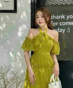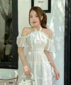 ĐẦM TRỄ VAI TAY BÈO CỘT NƠ CỔ MOCKING PHÍA SAU(CÓ MÚT) BH85F- NANA FREESIZE < 55KG