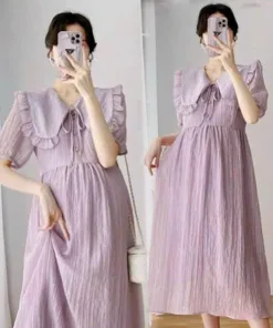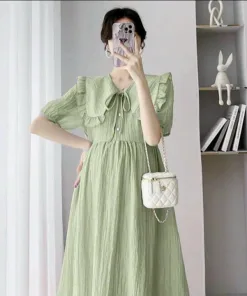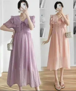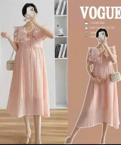 ĐẦM VÁY BẦU TAY BO CỔ LÁ SEN CÀI NÚT BV1163 – NANA FREESIZE < 65KG