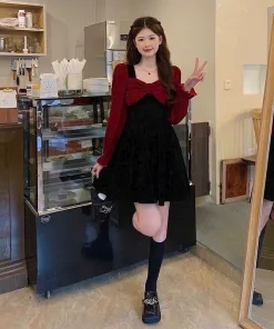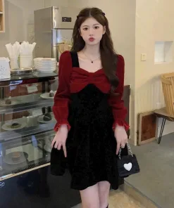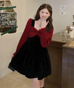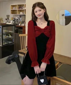 ĐẦM VÁY NHUNG CỔ NƠ TAY DÀI PHỐI MÀU DD1008- NANA FREESIZE < 53KG