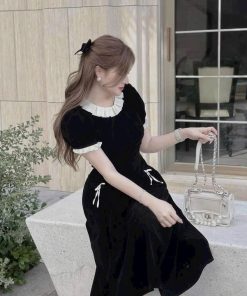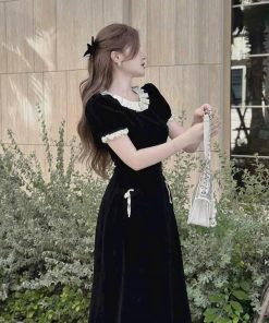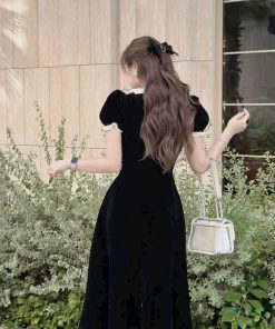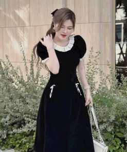 ĐẦM VÁY NỮ CHẤT NHUNG PHỐI BÈO CỔ FORM XÒE SH850 – SAM FREESIZE < 53KG