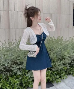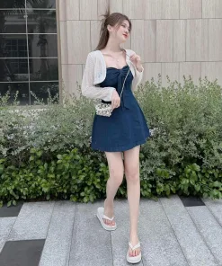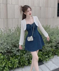 ĐẦM VÁY NỮ DENIM GIẢ JEAN KÈM ÁO KHOÁC REN TAY DÀI SA984 – SAM FREESIZE < 53KG