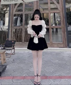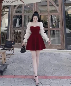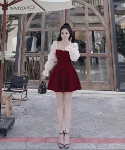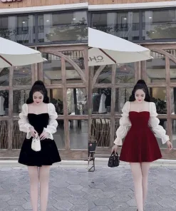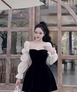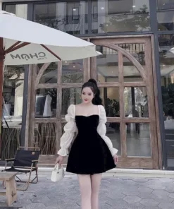 ĐẦM VÁY NỮ NHUNG PHỐI TƠ CỔ VUÔNG BH853 – NANA FREESIZE < 53KG