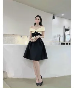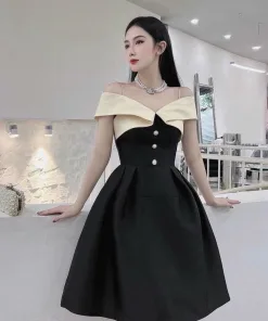ĐẦM VÁY NỮ TAFTA RỚT VAI ĐEN PHỐI TRẮNG SA654 – SAM FREESIZE <55 KG