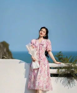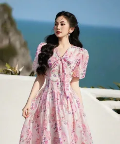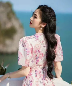 ĐẦM VÁY NỮ VOAN HOA TAY PHỒNG CỘT NƠ DD5019 – NANA FREESIZE < 53KG