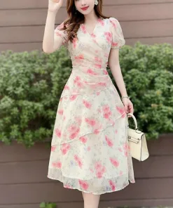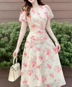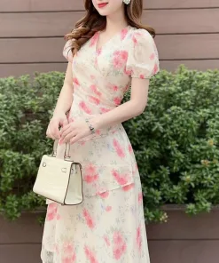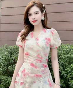 -Đầm váy nữ voan hoa xếp ly tay phồng chiết eo xinh xắn nhẹ nhàng dành cho các tình yêu