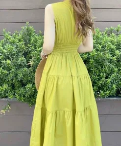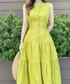 Tên sản phẩm: ĐẦM XANH DÁNG XÒE CỔ TRÒN SÁT NÁCH CHUN BO EO CHẤT LỤA CHÉO M429