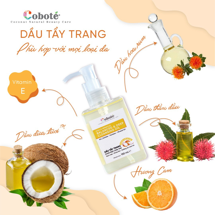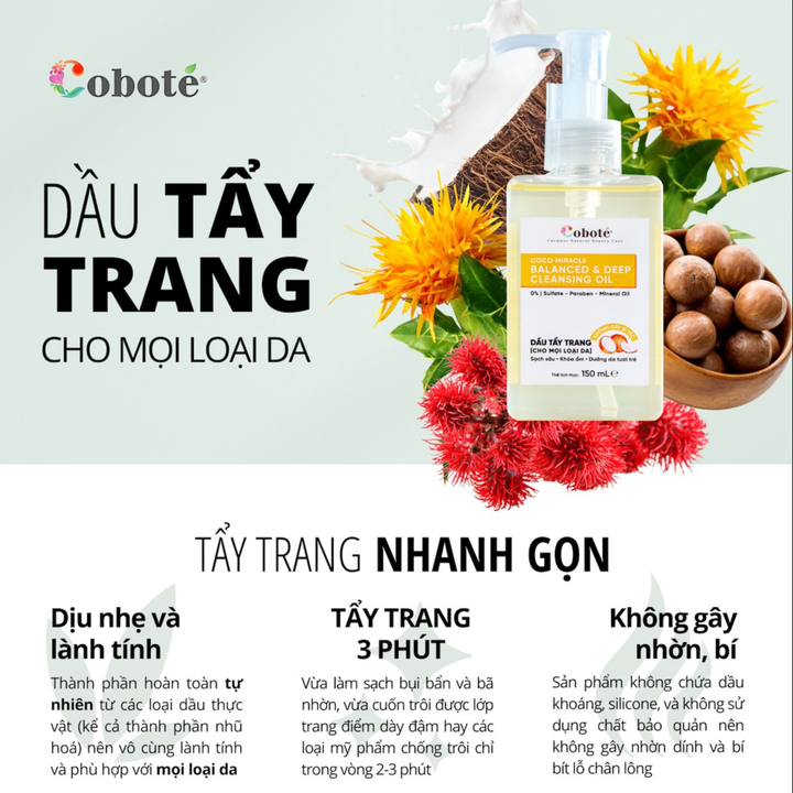 Hãy để Dầu tẩy trang & Làm sạch cân bằng Coco Miracle Balanced and Deep Cleansing Oil Coboté giúp bạn chăm sóc cho làn da sáng mịn, sạch mụn mà không sử dụng hoá chất. Coboté là sự lựa chọn tốt nhất cho việc chăm sóc làn da tự nhiên của bạn.