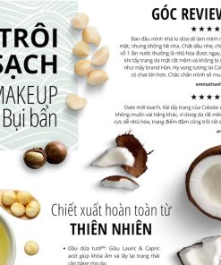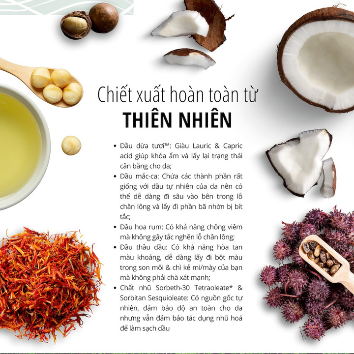 3. Thành phần không chứa dầu khoáng gồm dầu hoa rum, dầu thầu dầu & dầu mắc ca ít gây bít tắc lỗ chân lông, làm sạch hiệu quả bụi bẩn và bã nhờn hiệu quả;