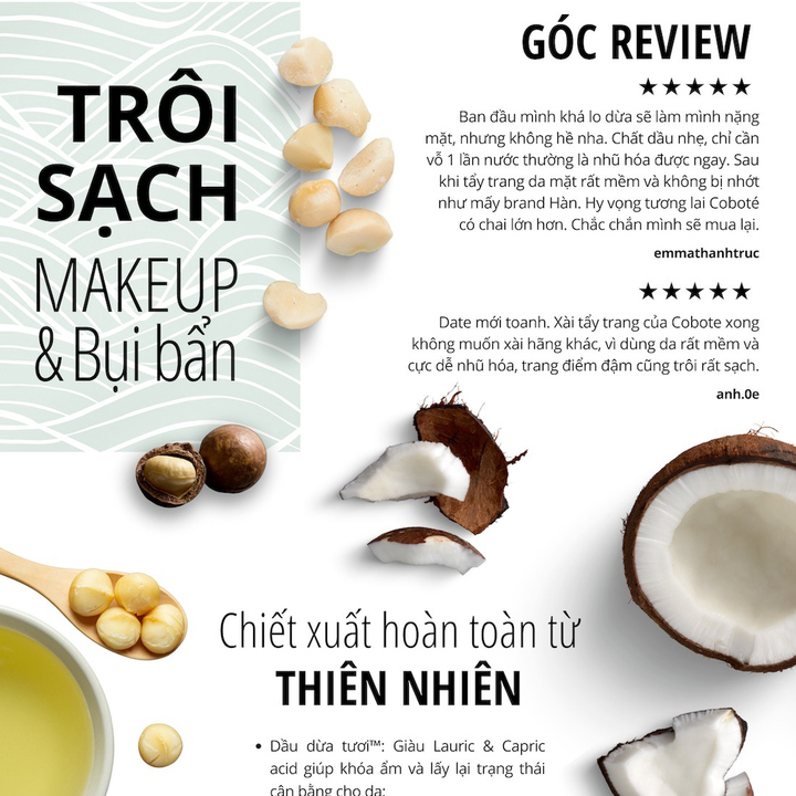 Khai thác sức mạnh làm sạch và dưỡng ẩm sâu của Dầu dừa Việt Nam truyền thống kết hợp với hệ dưỡng chất thực vật thiên nhiên trong công thức làm sạch sâu cân bằng Coco Balanced Deep Cleanse™ giúp cuốn trôi bụi bẩn, bã nhờn và những lớp trang điểm dày đậm sâu tận lỗ chân lông mà nước tẩy trang thông thường không làm được. Đồng thời, sản phẩm còn có tác dụng duy trì sự cân bằng tự nhiên của làn da, giúp da sạch khỏe và sáng mịn và mà không hề tạo cảm giác bí bít khó chịu.
