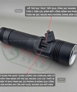 ✔ Sử dụng pin 26650 dung lượng cao 4.000mah, đèn có thêm tính năng hỗ trợ sạc ngược cho các thiết bị điện tử như trạm sạc dự phòng di động qua cổng usb những khi cần gấp hoặc những khi mất điện
