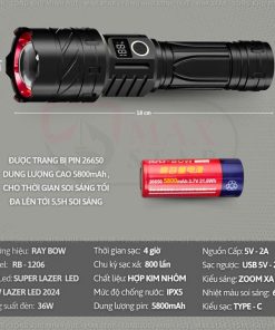 Đèn pin cầm tay siêu sáng RAYBOW 1206 zoom xa gần 4 chế độ sáng hiển thị phần trăm pin sạc ngược cho điện thoại GD236