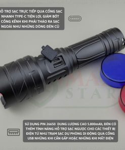 ✔ Sử dụng pin 26650 dung lượng cao 5.800mah, đèn có thêm tính năng hỗ trợ sạc ngược cho các thiết bị điện tử như trạm sạc dự phòng di động qua cổng USB những khi cần gấp hoặc những khi mất điện