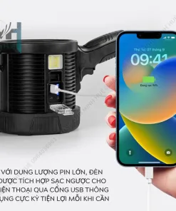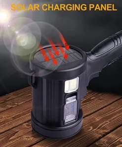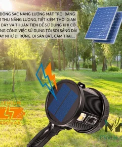 Thân đèn có trang bị tay nắm, công tắc rất chắc chắn và thuận tiện. Ngoài ra, thân đèn còn trang bị tấm pin năng lượng mặt trời kích thước 9×6cm cao cấp, dùng để sạc đầy pin cho đèn khi để ngoài trời, hoặc quý khách có thể sạc bằng khe cắm sạc