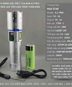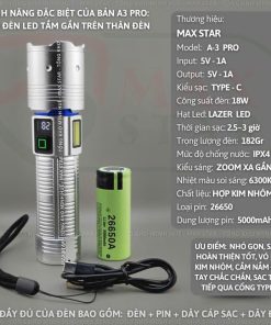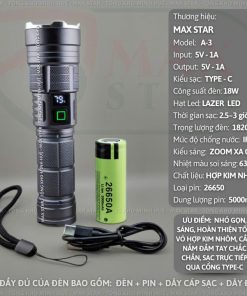 Đèn pin cầm tay siêu sáng zoom xa gần MAX STAR A3 PRO hiển thị pin tích hợp sạc nhanh chống nước IPX7 siêu sáng xa 500m GD212