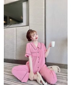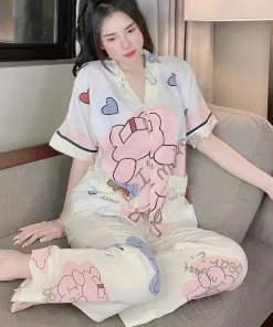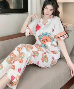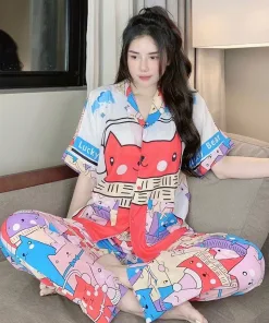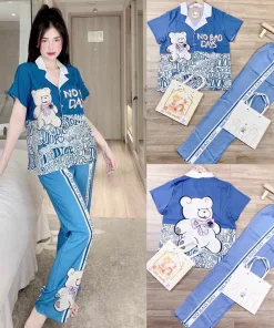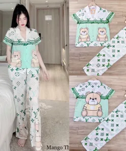 - Tên sản phẩm: Đồ Mặc Nhà Pijama Lụa Mango Thiết Kế Tay Ngắn Quần Dài Freesize Từ 42-58kg – Queen