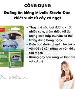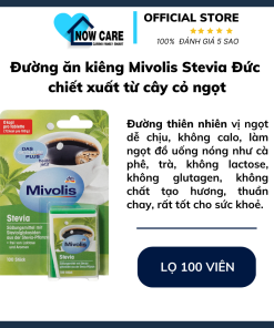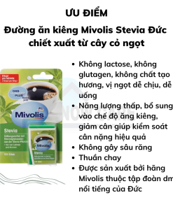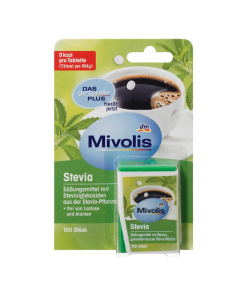- Đường ăn kiêng Mivolis Stevia Đức chiết xuất từ cây cỏ ngọt lọ 100 viên là loại đường thiên nhiên, có vị ngọt dễ chịu, không chứa calo và thích hợp làm ngọt đồ uống nóng như cà phê hoặc trà, không chứa lactose, không chứa glutagen, không chất tạo hương, thuần chay, rất tốt cho sức khoẻ.