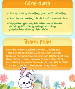 Purified Water, Glycerin, Xylitol, Cyamopsis Tetragonoloba (Guar) Gum, Calcium Lactate, Sodium Fluoride, Propolis Extract (Dịch Chiết Keo Ong), Glycyrrhiza Uralensis Extract (Dịch Chiết Cam Thảo), Camellia Sinensis, Extract (Dịch Chiết Trà Xanh), Sodium Benzoate , Fragrance