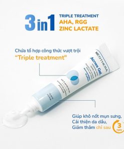 – Với tổ hợp công thức vượt trội “Triple treatment AHA, RGG và Kẽm Zinc laclate”, Neothera Acnes Gel không chỉ kịp thời dịu nốt mụn, khô còi mụn mụn trứng cá, mụn bọc, mụn đầu đen,.. mà còn ngăn ngừa sự bám dính của các vi khuẩn gây mụn và cải thiện làn da sáng khỏe, hạn chế bóng dầu.