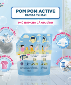 GEL GIẶT XẢ 2IN1"LÀNH" CHO CẢ NHÀ POMPOM ACTIVE SẠCH SÂU VẾT BẨN – DƯỠNG MỚI VẢI – LƯU HƯƠNG TÍCH HỢP KHÁNG KHUẨN AN TOÀN CHO ĐỒ LÓT-COMBO TÚI 2.7L
