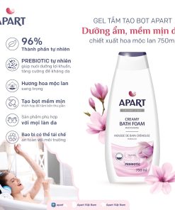 Gel tắm tạo bọt Apart dưỡng ẩm, mềm mịn da chiết xuất hoa mộc lan 750ML chứa chiết xuất từ hoa mộc lan thơm mát và các thành phần được lựa chọn cẩn thận giúp dưỡng ẩm da, mang lại cảm giác sảng khoái sau khi tắm.