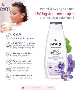 Mô tả sản phẩm: Gel tắm tạo bọt Apart dưỡng ẩm, mềm mịn da chiết xuất hoa violet 750ML với khả năng làm sạch sâu, đồng thời mang đến hương thơm lôi cuốn và độ lưu hương dài lâu cho cơ thể luôn sạch sẽ và thơm tho. Bên cạnh đó, sản phẩm còn được bổ sung thêm prebiotics tự nhiên để giúp làn da được dưỡng ẩm, sáng khỏe. Công thức thuần chay, thành phần thiên nhiên, không gây kích ứng.