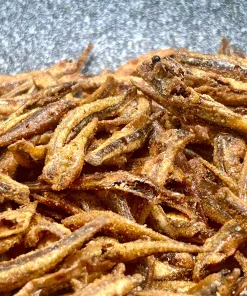-Thành phần: 80% cá cơm chiên tách dầu, 5% sa tế, 5% bột BBQ, 10% gia vị (nước mắm, đường, ớt, tỏi).