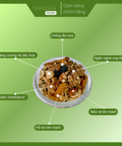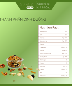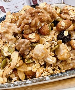 - Thành phần: Hạnh nhân, óc chó, macca, điều, hạt bí, yến mạch 5%, trái cây sấy, mật ong